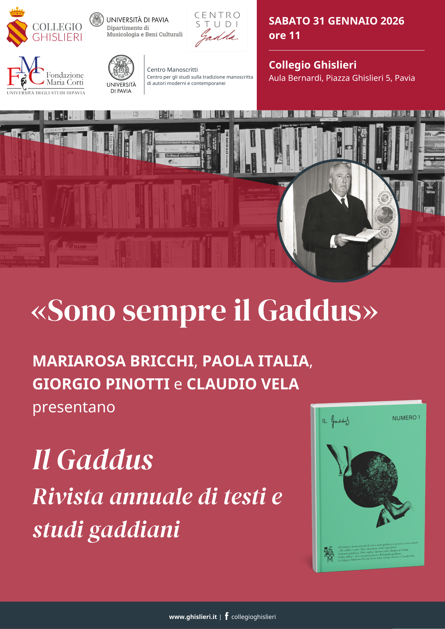 Sabato 31 gennaio 2026, alle ore 11.00, al Collegio Ghislieri di Pavia viene presentata la rivista annuale «Il Gaddus». Intervengono i direttori della rivista e membri del Centro Studi Gadda: Mariarosa Bricchi, Paola Italia, Giorgio Pinotti e Claudio Vela.