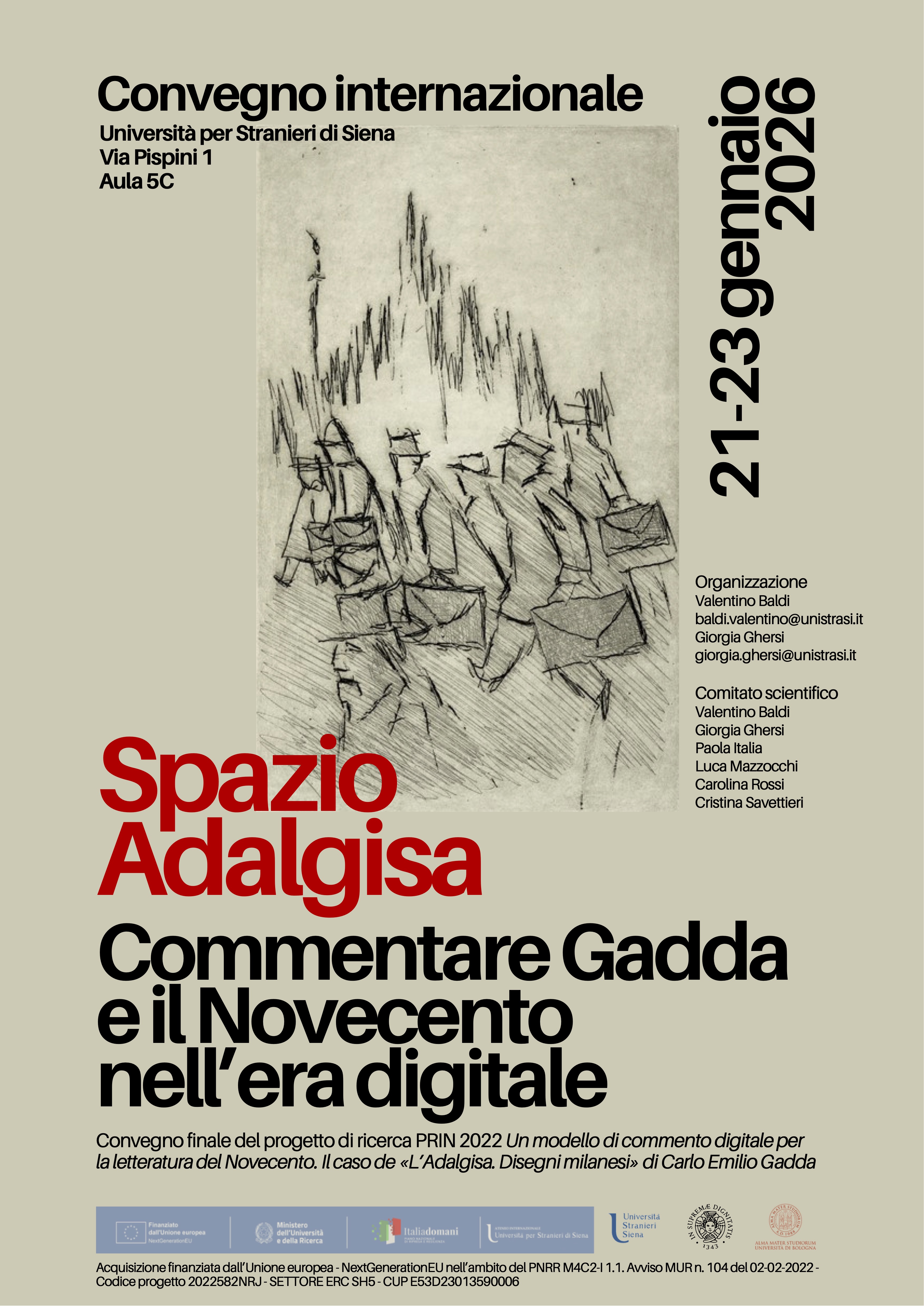 Dal 21 al 23 gennaio 2026 presso l’Università per Stranieri di Siena si terrà il convegno internazionale Commentare Gadda e il Novecento nell’era digitale, convegno finale del progetto di ricerca PRIN 2022 Un modello di commento digitale per la letteratura del Novecento. Il caso de «L’Adalgisa. Disegni milanesi» di Carlo Emilio Gadda.